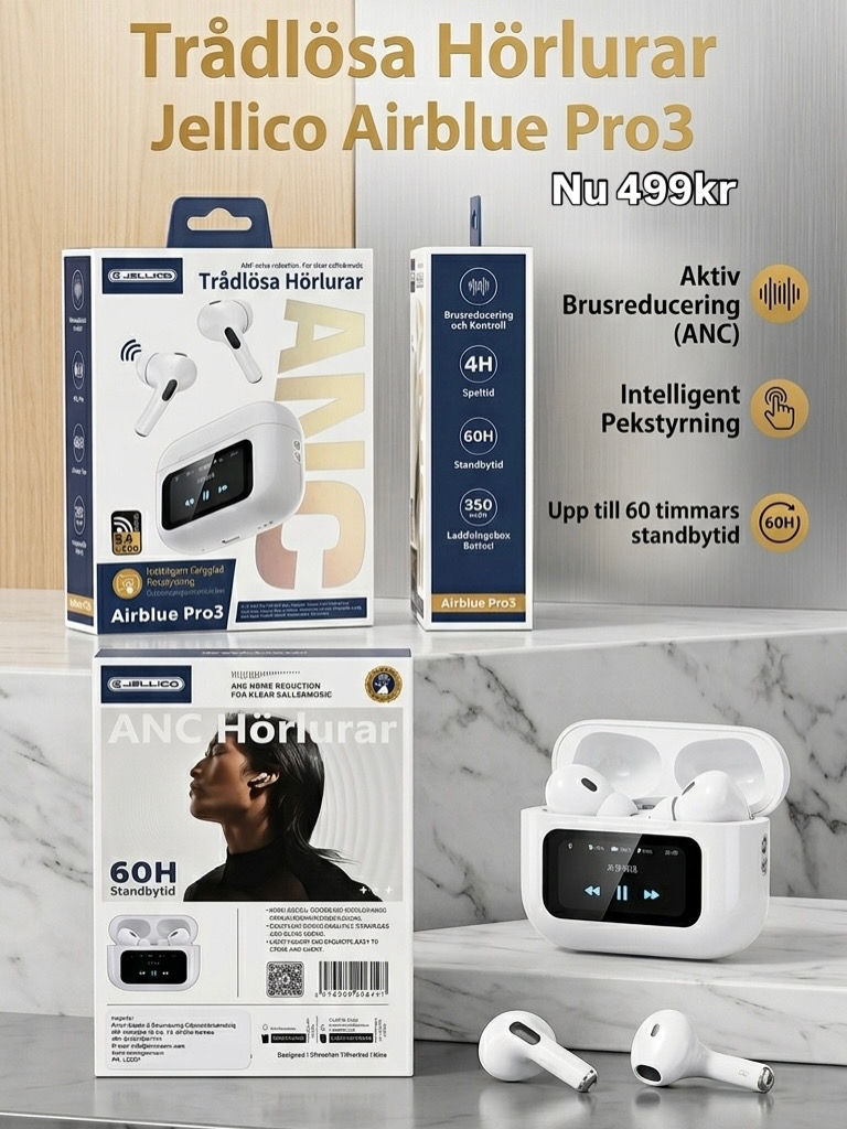 Upplev trådlös frihet och förstklassigt ljud med JELLICO AirBlue Pro 3 – eleganta och bekväma hörlurar designade för din vardag.
